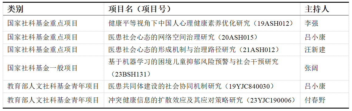 医疗与健康主题的社会心理学研究也是英国365集团官网社会心理学系长期坚持的研究方向和研究生招生的重点方向。近5年来,全系已陆续获批医疗与健康主题的国家社科基金重点项目3项、一般项目1项,教育部人文社科基金青年项目2项,呈现出良好的学术成长性和项目梯次性。