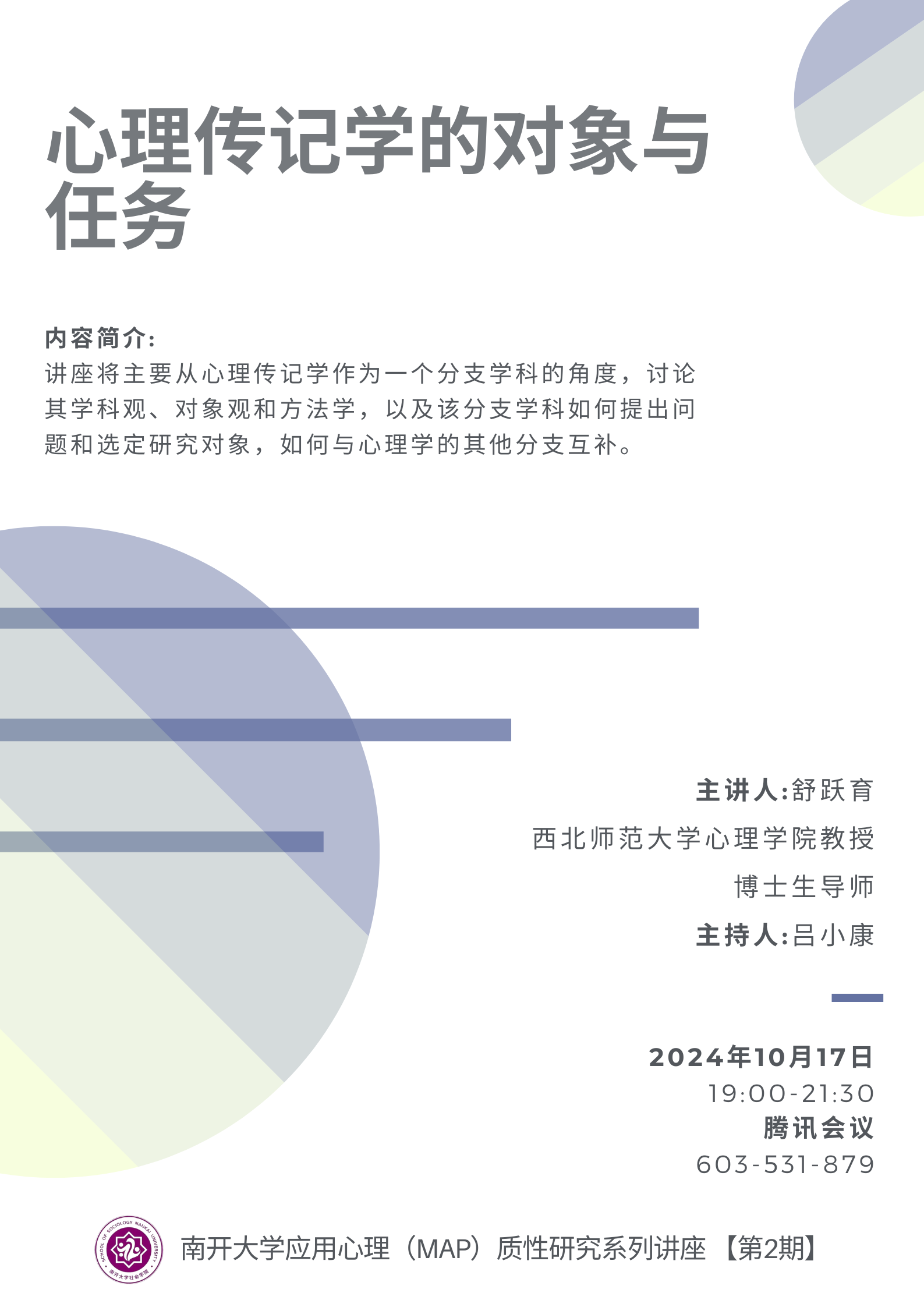 内容简介:讲座将主要从心理传记学作为一个分支学科的角度,讨论其学科观、对象观和方法学,以及该分支学科如何提出问题和选定研究对象,如何与心理学的其他分支互补。