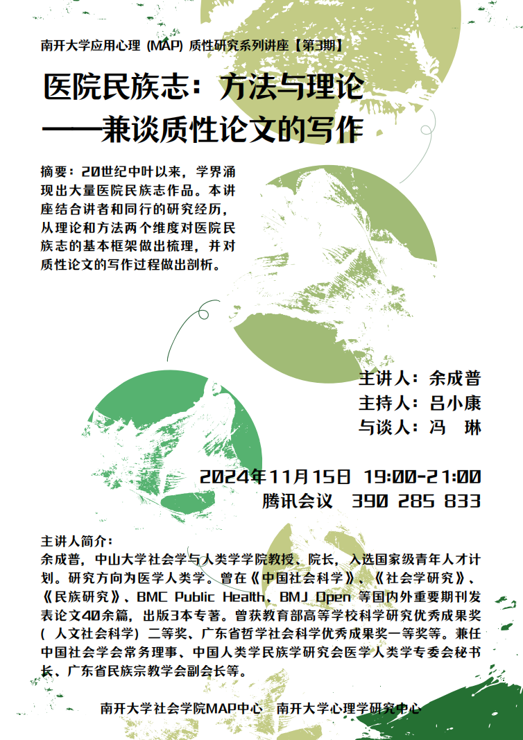 主讲人简介:余成普,中山大学社会学与人类学公司教授、经理,入选国家级青年人才计划。研究方向为医学人类学。曾在《中国社会科学》、《社会学研究》、《民族研究》、BME Public Heath、BMJ Open 等国内外重要期刊发表论文4余篇,出版3本专著。曾获教育部高等公司科学研究优秀成果奖(人文社会科学)二等奖、广东省哲学社会科学优秀成果奖一等奖等。兼任中国社会学会常务理事、中国人类学民族学研究会医学人类学专委会秘书长、广东省民族宗教学会副会长等。