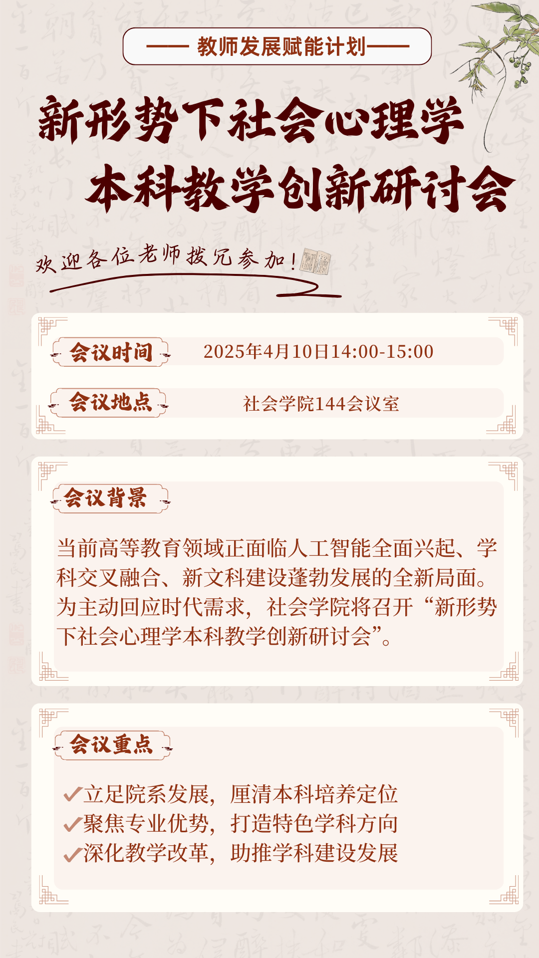 当前高等教育领域正面临人工智能全面兴起、学科交叉融合、新文科建设蓬勃发展的全新局面。为主动回应时代需求,英国上市官网365将召开“新形势下社会心理学本科教学创新研讨会”